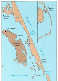Roanoke Island, North Carolina, lies in a body of water between the Albemarle and Pamlico Sounds. The island is about 8 miles long and 2 miles wide. The mainland is a few miles to the west. The outer banks lie a short distance to the east, separated from the island by a narrow channel.